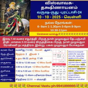 தினசரி நாள்காட்டி 10.10.2025 விஸ்வாவசு வருடம் புரட்டாசி மாதம் 24ந் தேதி. வெள்ளிக்கிழமை. இரவு 7.40 வரை சதுர்த்தி பிறகு நாள் முழுவதும் தே.பஞ்சமி திதி . மாலை 5.19 வரை கிருத்திகை பிறகு நாள் முழுவதும் ரோகிணி நட்சத்திரம். இன்று பகல் முழுவதும் யோகநாள் . சந்தராஷ்டமம்: சித்திரை. சுவாதி.