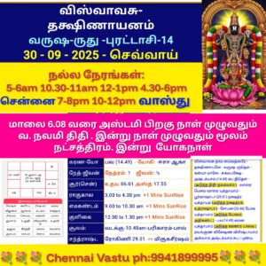 தினசரி நாள்காட்டி 30.9.2025 விஸ்வாவசு வருடம் புரட்டாசி மாதம் 14ந் தேதி. செவ்வாய்க்கிழமை. மாலை 6.08 வரை அஸ்டமி பிறகு நாள் முழுவதும் வ. நவமி திதி . இன்று நாள் முழுவதும் மூலம் நட்சத்திரம். இன்று யோகநாள் . சந்தராஷ்டமம்: .மிருஹசீரிசம்.