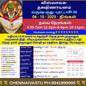 தினசரி நாள்காட்டி 6.10.2025 விஸ்வாவசு வருடம் புரட்டாசி மாதம் 20ந் தேதி. திங்கட்க்கிழமை. மதியம் 12.25 வரை வ.சதுர்தசி பிறகு நாள் முழுவதும் பவுர்ணமி திதி . விடியற்க்காலை 3.49 வரை உத்திரட்டாதி பிறகு நாள் முழுவதும் ரேவதி நட்சத்திரம். இன்று யோகநாள் . சந்தராஷ்டமம்: ஆயில்யம். மகம்.