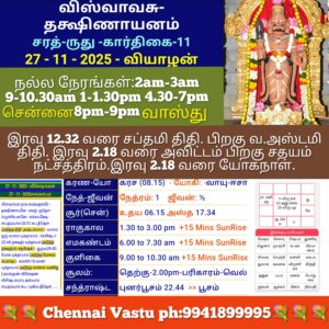 தினசரி நாள்காட்டி 27-11-2025 விஸ்வாவசு வருடம் கார்த்திகை மாதம் 11ந் தேதி. வியாழக்கிழமை. இரவு 12.32 வரை சப்தமி திதி. பிறகு வ.அஸ்டமி திதி. இரவு 2.18 வரை அவிட்டம் பிறகு சதயம் நட்சத்திரம்.இரவு 2.18 வரை யோகநாள். சந்தராஷ்டமம்: புனர்பூசம். பூசம்.