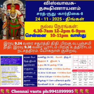 தினசரி நாள்காட்டி 24-11-2025 விஸ்வாவசு வருடம் கார்த்திகை மாதம் 8ந் தேதி. திங்கட்கிழமை. இரவு 9.24 வரை சதுர்த்தி திதி. பிறகு வ.பஞ்சமி திதி. இரவு 9.38 வரை பூராடம் பிறகு உத்திராடம் நட்சத்திரம். யோகநாள் குறைவு. சந்தராஷ்டமம்: ரோகிணி மிருஹசீரிசம்.