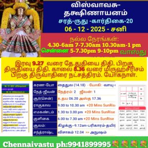 தினசரி நாள்காட்டி 6-12-2025 விஸ்வாவசு வருடம் கார்த்திகை மாதம் 20ந் தேதி. சனிக்கிழமை. இரவு 9.27 வரை தே.துதியை திதி. பிறகு திருதியை திதி. காலை 8.36 வரை மிருஹசீரிசம் பிறகு திருவாதிரை நட்சத்திரம். யோகநாள். சந்தராஷ்டமம்: . விசாகம் அனுசம்.