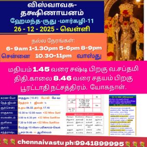 #ApartmentVastuChennaiதினசரி நாள்காட்டி 26-12-2025 விஸ்வாவசு வருடம் மார்கழி மாதம் 11ந் தேதி. வெள்ளிக்கிழமை. மதியம் 1.45 வரை சஷ்டி பிறகு வ.சப்தமி திதி.காலை 8.46 வரை சதயம் பிறகு பூரட்டாதி நட்சத்திரம். யோகநாள். சந்தராஷ்டமம்: புனர்பூசம் ஆயில்யம்.