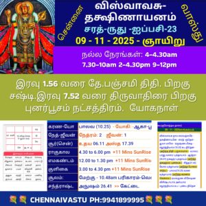 தினசரி நாள்காட்டி 9-11-2025 விஸ்வாவசு வருடம் ஐப்பசி மாதம் 23ந் தேதி.ஞாயிறு. இரவு 1.56 வரை தே.பஞ்சமி திதி. பிறகு சஷ்டி.இரவு 7.52 வரை திருவாதிரை பிறகு புனர்பூசம் நட்சத்திரம். யோகநாள் . சந்தராஷ்டமம்: அநுசம் சேஸ்டா.