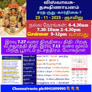 தினசரி நாள்காட்டி 23-11-2025 விஸ்வாவசு வருடம் கார்த்திகை மாதம் 7ந் தேதி. ஞாயிற்றுக்கிழமை. இரவு 7.27 வரை திருதியை திதி. பிறகு வ.சதுர்த்தி திதி. இரவு 7.13 வரை மூலம் பிறகு பூராடம் நட்சத்திரம். யோகநாள் . சந்தராஷ்டமம்: கிருத்திகை ரோகிணி