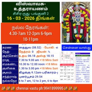 தினசரி நாள்காட்டி 16-3-2026 விஸ்வாவசு வருடம் பங்குனி மாதம் 2ந் தேதி. திங்கட்கிழமை. காலை 9.43 வரை த்வாதசி திதி பிறகு தே.திரயோதசி திதி. நாள் முழுவதும் அவிட்டம் நட்சத்திரம். யோகநாள். கீழ்நோக்குநாள்.
