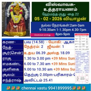 மங்களம் உண்டாகட்டும்.உடன்பிறப்பான பிரியமுள்ள தமிழ் ரத்த சொந்தங்களுக்கு சென்னை வாஸ்து ஜெகன்னாதனின் வணக்கங்கள். மண்ணில் நல்ல வண்ணம் வாழலாம் வைகலும்..தினசரி நாள்காட்டி 5-2-2026 விஸ்வாவசு வருடம் தை மாதம் 22ந் தேதி. வியாழக்கிழமை. இரவு 12.24 வரை சதுர்த்தி திதி. பிறகு தே.பஞ்சமி. இரவு 10.43 வரை உத்திரம் பிறகு அஸ்தம் நட்சத்திரம். பகல் முழுவதும் யோகநாள் குறைவு . மேல்நோக்குநாள்.