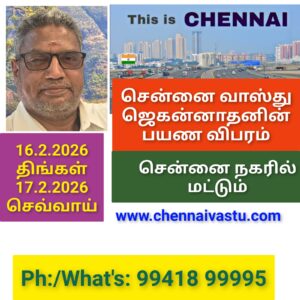 வாஸ்து விஜயமாக சென்னை மற்றும் புறநகர் பகுதிகளில் அதாவது 16.2.2026 திங்கள் மற்றும், 17.2.2026 செவ்வாய் இரண்டு நாட்கள் மட்டும் சென்னை சார்ந்த புறநகர் பகுதிகளில் குறிப்பாக சென்னை மாவட்டம் சார்ந்த எண்ணூர் , கேளம்பாக்கம், பெருங்களத்தூர்,போரூர், வளசரவாக்கம் பகுதிகளில் வாஸ்து ஆலோசனை பயணத்தில் இருக்கின்றேன். ஆகவே மேற்கூறிய பகுதிகளில்